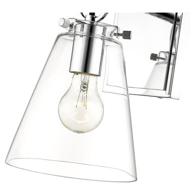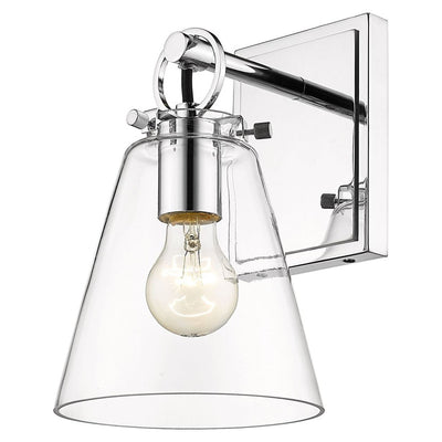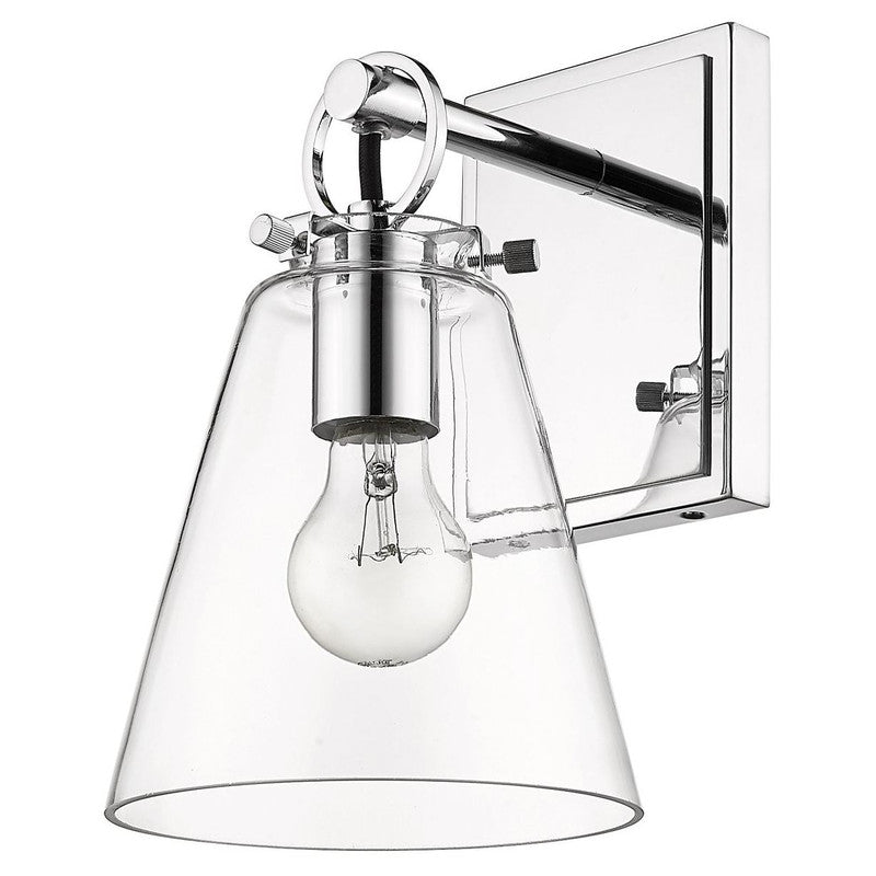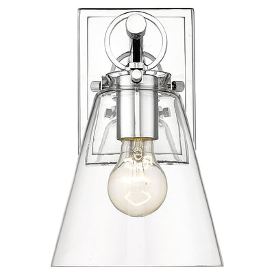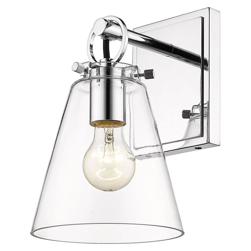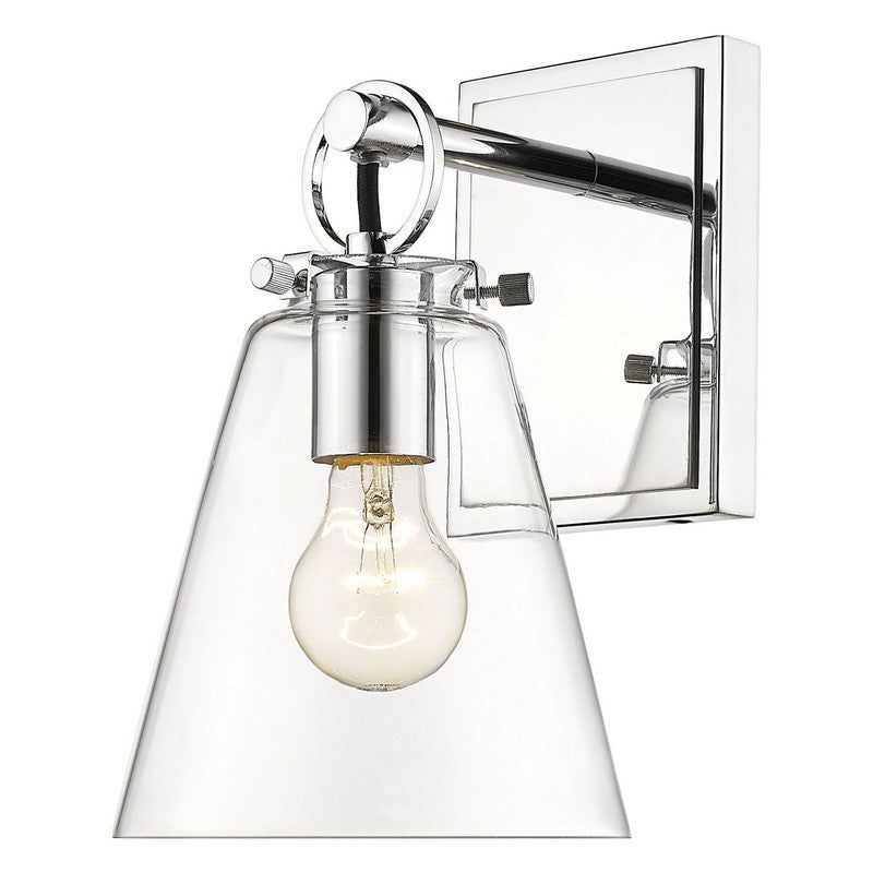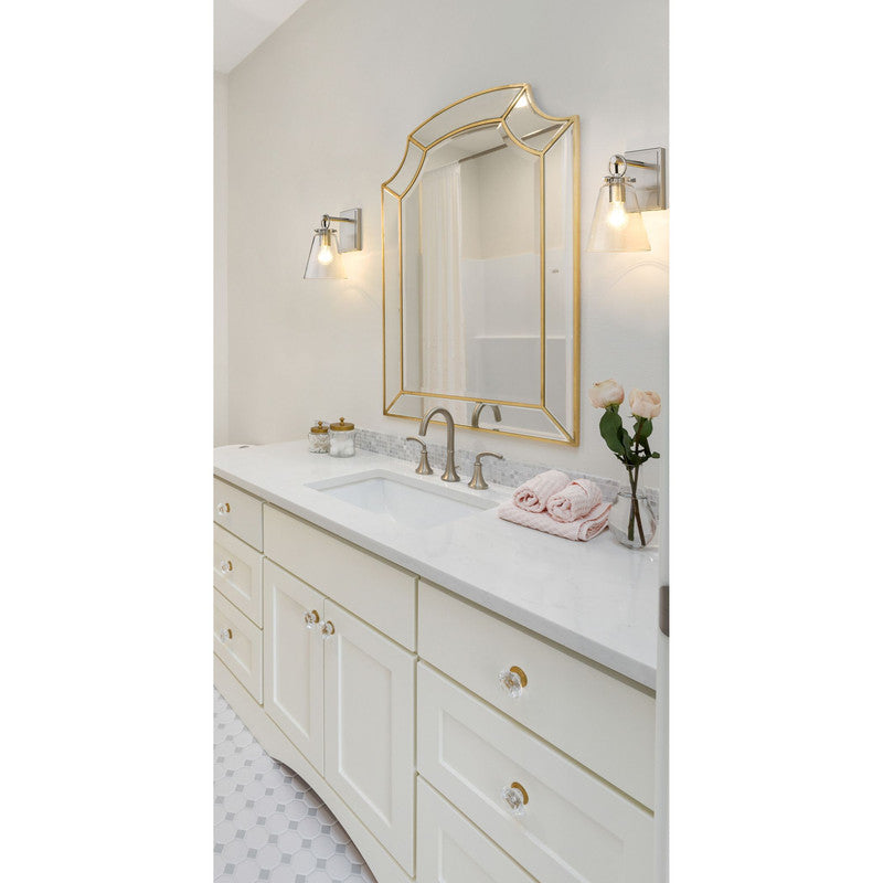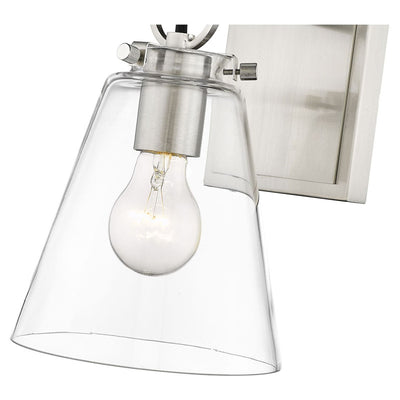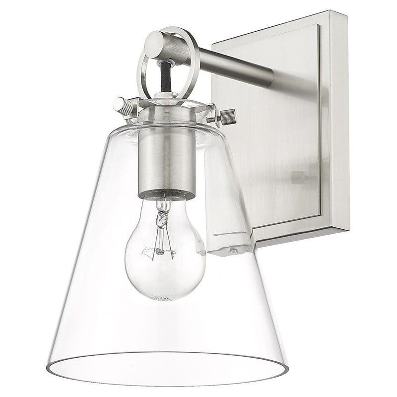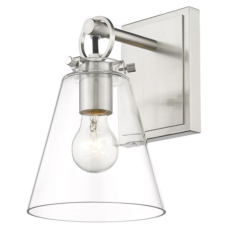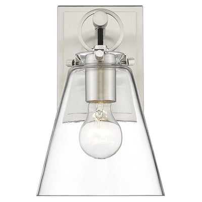 Contemporary bathrooms light up with the chic, delicate design of this one-light wall sconce. With a conical shade crafted of clear glass, it adds a charming motif with a brushed nickel finish hand-tooled steel mount adding festive geometric accents. This light from the Harper collection dazzles in a custom bath space.