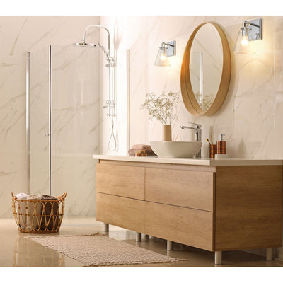This contemporary bath collection is distinguished by attention to detail as it delivers fresh, inspiring materials from its hand-tooled mount holding the conical glass shade to its full backplate. Make a bathroom come to life with the Harper Collection, available in Polished Chrome or Brushed Nickel finishes.
