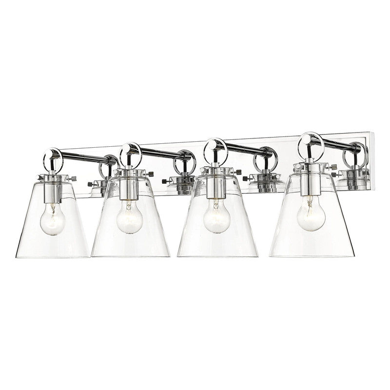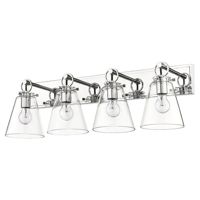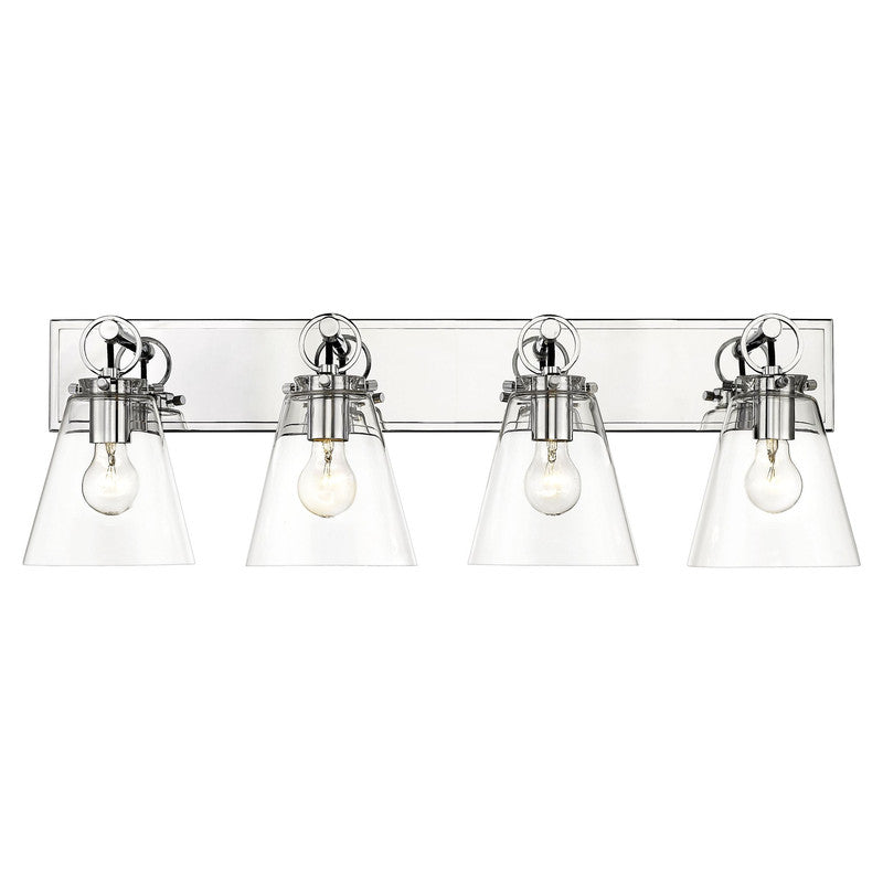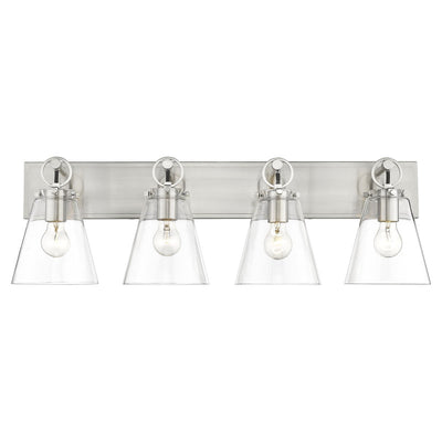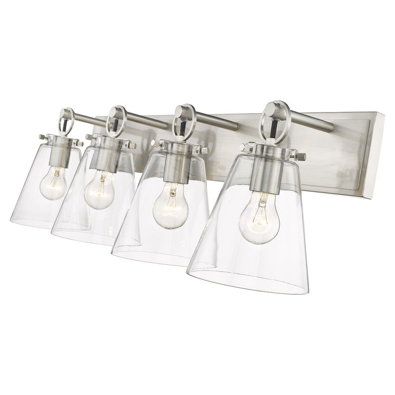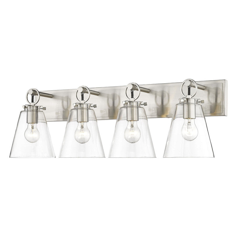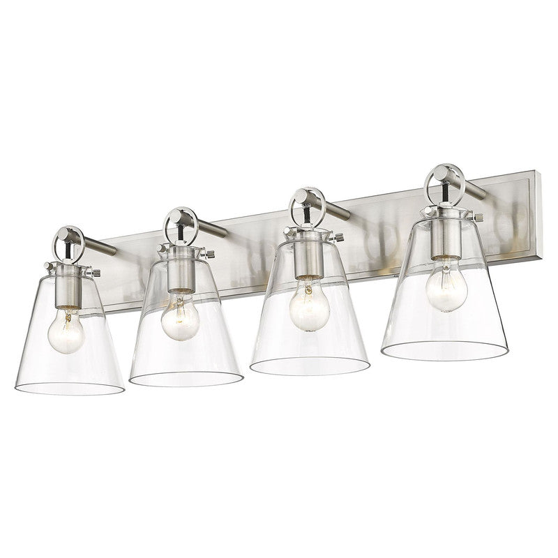 This modern four-light vanity bath light captures a sophisticated aesthetic with nautical inspiration, perfect for an upscale custom bath space. Indulge in delicate conical shades made of clear glass and a sleek brushed nickel finish wall mount updated with charming ring and peg accents. Perfect for a mid-sized to larger vanity, this light becomes a focal point.