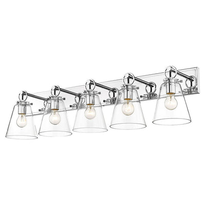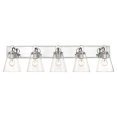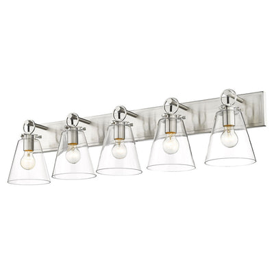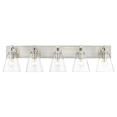 Graceful elegance follows linear styling to deliver a fashionable way to illuminate a contemporary bath space. This five-light vanity light from the Harper collection offers inspiring nautical charm with upscale materials and finishes. A brushed nickel finish steel wall mount and ring and peg accents add whimsical vibes to five delicate conical shades fashioned of sleek clear glass.
