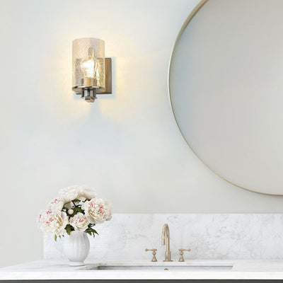 Classic elegance follows this one-light wall sconce from the Beckett collection, a superb choice for a contemporary bath space, hallway, or main living area. A simple yet extraordinary design blends romantic clear seedy glass with a mount, base, and arm crafted of sleek brushed nickel finish steel.