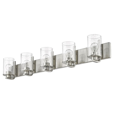 A modern version of nautical charm makes its way into this five-light vanity light from the Beckett collection, adding a pleasing touch to any space. Larger bath areas light up with this vanity light fashioned of brushed nickel finish steel with a rectangular wall mount and charming accents. Clear seedy glass shades in cylindrical form offer a delicate, natural infusion of romance.