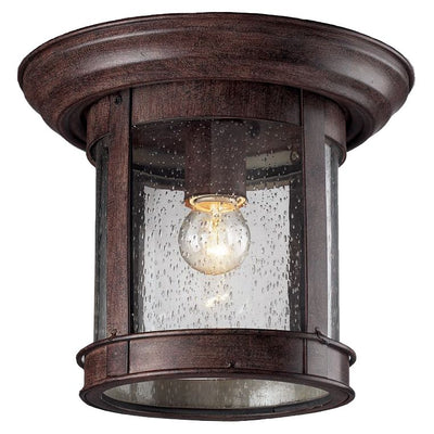 This cast aluminum outdoor flush mount uses seedy clear glass to create a unique look, along with the black finish.
