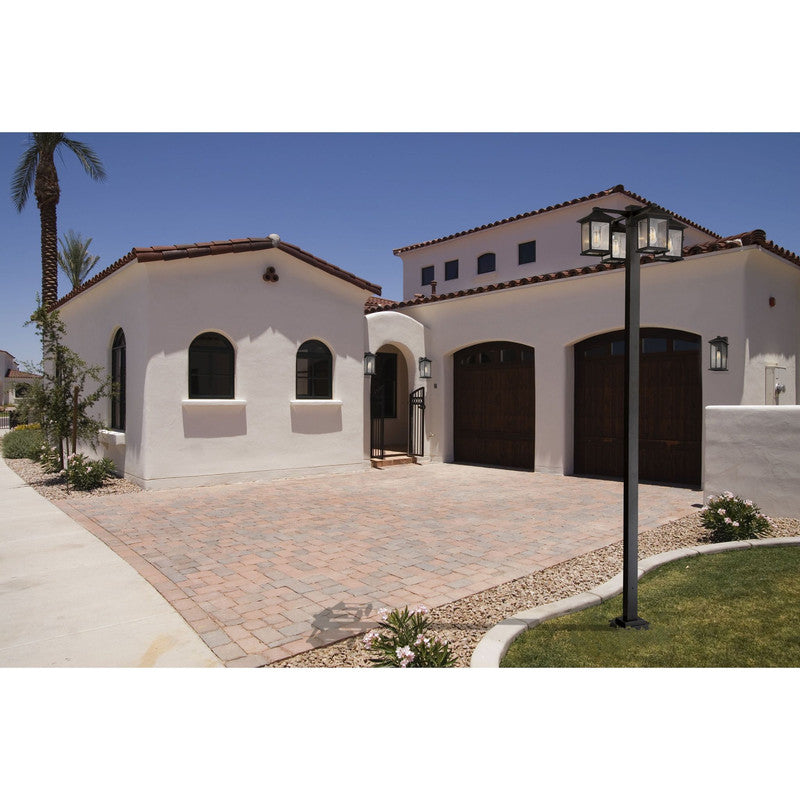 Four large lights are clustered at the top of this tall outdoor post light. Designed to deliver outstanding overhead lighting, this fixture features classic lantern-inspired shades and a rich black finish to complement any exterior decor.