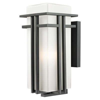 The geometric lines of the Abbey family combine well with contemporary home styling as well as homes in the craftsmen style. This large wall mount fixture is made of steel and finished in black with matte opal glass.