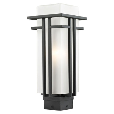 The geometric lines of the Abbey family combine well with contemporary home styling as well as homes in the craftsmen style. This medium outdoor post head fixture is made of steel and finished in black with matte opal glass.