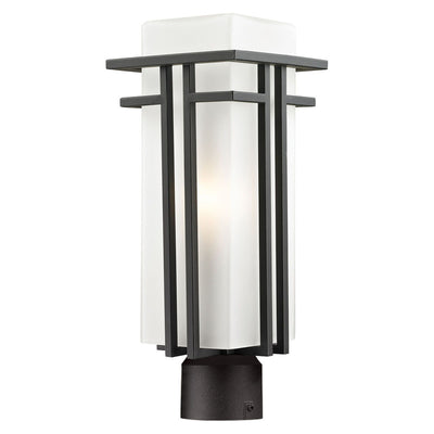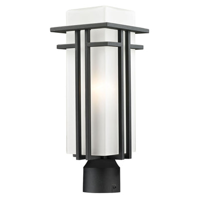 The geometric lines of the Abbey family combine well with contemporary home styling as well as homes in the craftsmen style. This medium outdoor post head fixture is made of steel and finished in black with matte opal glass.