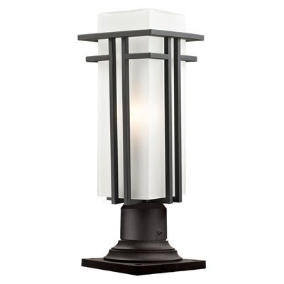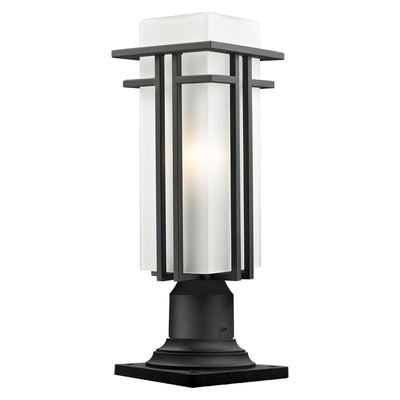 The geometric lines of the Abbey family combine well with contemporary home styling as well as homes in the craftsmen style. This medium outdoor pier mount fixture is made of steel and finished in black with matte opal glass.