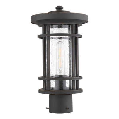 Romantic clear seedy glass offers a textured effect to the cylindrical shade of this outdoor post lantern. Enjoy a bold black finish and an embellished design that complements exterior walkways and garden spaces.