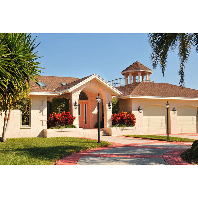 This two light, broad-based outdoor post mounted fixture adds a classic silhouette to the lighting in your patio, deck or other outdoor area. With its candelabra composition, the lamp provides soft, effective illumination. A multi-sided clear beveled glass shade has a black steel frame, creating an elegant impression.