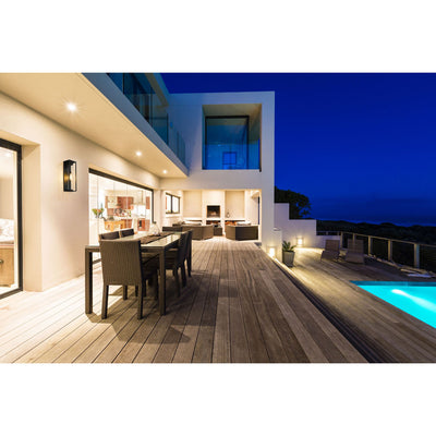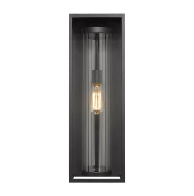 Minimal and understated, this modern outdoor wall sconce from the Dunbroch collection makes a wonderful addition to a veranda entertaining area. Its long box-like aluminum frame features three open sides and a black metal finish. Perfect for patios, a single drop down light protected by a clear cylindrical globe casts a soothing glow.