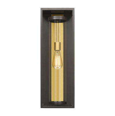 An even mix of modern and transitional elements makes the Dunbroch family of outdoor lighting the perfect choice for today�s home. This aluminum fixture features a single, exposed bulb that appears to float within a clear glass tube. An open metal, rectangular cage completes the design enhancing its clean-lined look. Available in deep bronze with an outdoor brass interior accent or black.