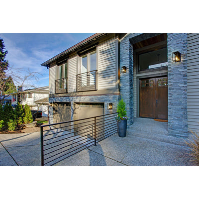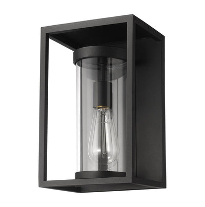 From the Dunbroch collection comes this minimalistic, modern outdoor wall sconce, perfectly suited for a porch entryway or patio entertainment area. Featuring an open rectangular aluminum frame as well as a single drop down light sheathed within a clear cylindrical glass globe, this sconce adds just the right amount of glow. Its striking dark black finish makes this exterior sconce able to complement existing building facades of various color palettes.