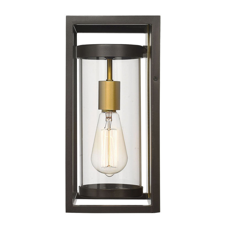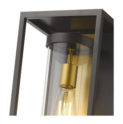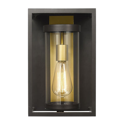 An even mix of modern and transitional elements makes the Dunbroch family of outdoor lighting the perfect choice for today�s home. This aluminum fixture features a single, exposed bulb that appears to float within a clear glass tube. An open metal, rectangular cage completes the design enhancing its clean-lined look. Available in deep bronze with an outdoor brass interior accent or black.