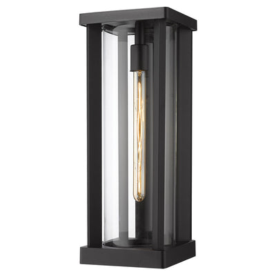 From the Glenwood collection comes this sophisticated, contemporary outdoor wall sconce, featuring a clear glass cylinder globe nestled inside a tall, rectangular aluminum frame. With a dark black finish that looks stylish and attractive against any exterior building materials, this wall sconce lends a striking, modern flair to any outdoor space. Flank a pair of these wall sconces beside a sliding glass door leading to a porch patio or veranda to provide adequate lighting and a relaxing glow.