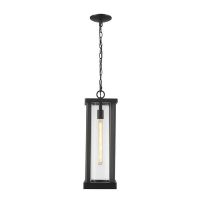 With a modern flair, this outdoor ceiling fixture from the Glenwood collection features a dark black finished frame hung by a drop mount chain. Perfectly suited for a more contemporary style home, this outdoor lighting fixture works nicely hung inside a covered portico or porch entryway. With a tube-like, clear glass cylinder sheathing the bulb and braced between a sleek aluminum lantern, this chain mount ceiling fixture adds a striking, yet humble look to greet you as you enter a space.