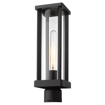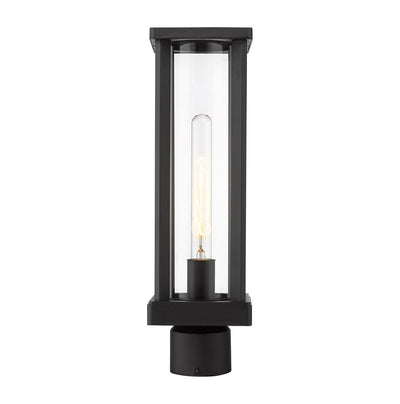 As part of the Glenwood lighting collection, this sleek and ultra-modern outdoor post mounted fixture is perfectly suited for landscapes and patio railings. Delicately sheathed in a tall and rectangular, contemporary aluminum frame, this post mount lighting piece features a cylindrical clear glass globe where a bright bulb shines through to illuminate a pathway. This lanterns dark black finish frame and pedestal base also complements a variety of architectural facade elements and color palettes.
