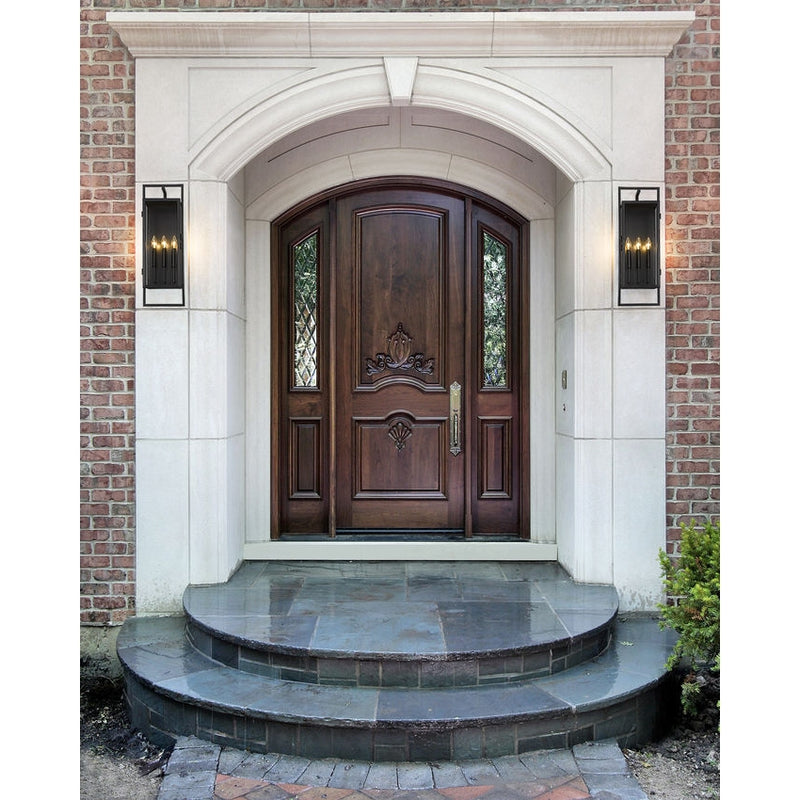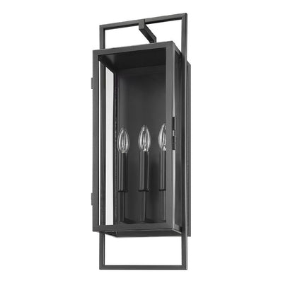 With a noticeable nod to contemporary style, this energetic exterior fixture offers a superb complement to updated spaces. The Lucian three-light outdoor wall sconce builds on a box-inspired base with an extra open base, showcasing an alignment of three candelabra style bulbs. Clear glass serves as an unobtrusive shield protecting bulbs, as bold black finish steel construction delivers a commanding presence.