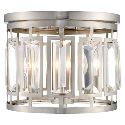 Add a decadent look to modern d�cor with this exceptional three-light flushmount ceiling light. Gorgeous brushed nickel finish steel and cut crystal panels emphasize the geometric-inspired character, softened with the romantic flavor of candelabra-style bulb bases.