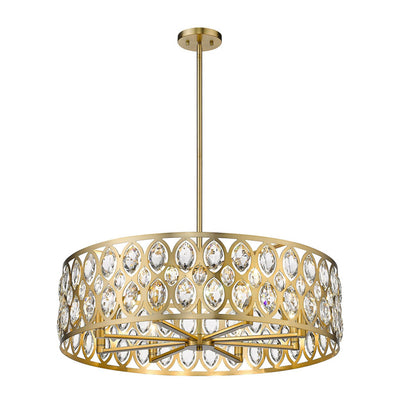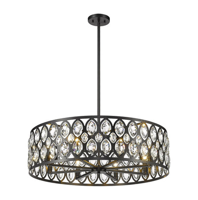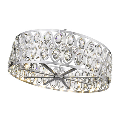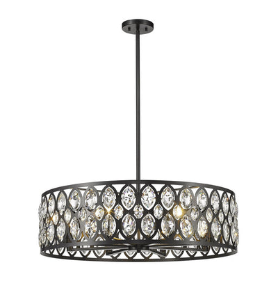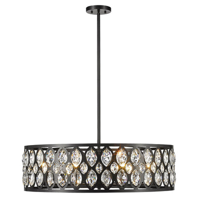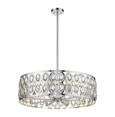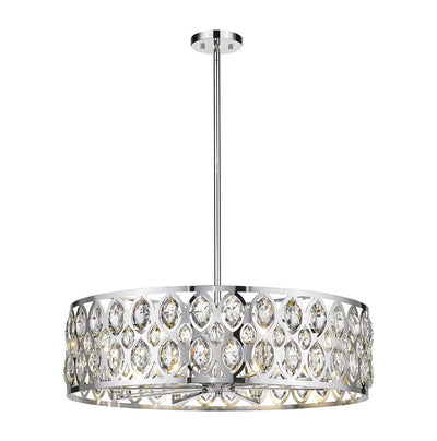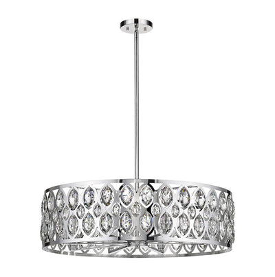 From the Dealey collection comes this elegant and wide eight-light chandelier. Featuring a round steel shade in a lustrous chrome finish, this lighting piece boasts an ellipse-carved pattern, each possessing a glimmering clear crystal pendant that dangles within. This charming and glamorous contemporary chandelier makes a wonderful addition to a great room or even hung above an entryway foyer.