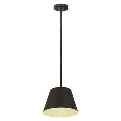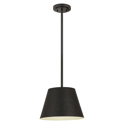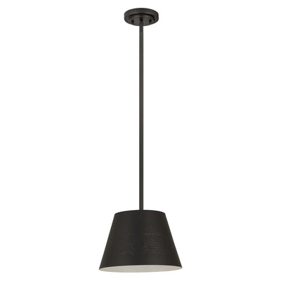 Take lighting in a new direction, weaving it into central d�cor elements within a custom casual space. The Maddox one-light pendant delivers sophistication with a laid-back feel in a conical shade, down rod, and canopy crafted of matte black finish iron. Its shade�s hammered belt detailing adds texturizing to up the ante on sleek design.