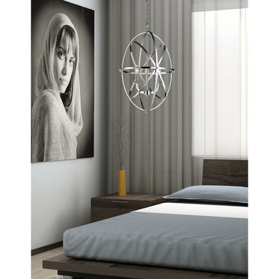 Orbiting metal bands circle the contemporary inner chandelier. This family is made up of round and oval shapes finished in brushed nickel and complimented with matte opal glass.
