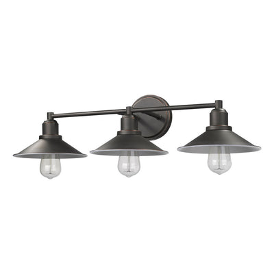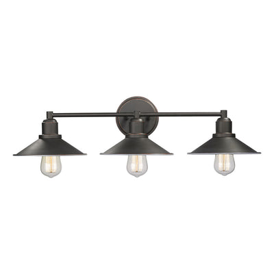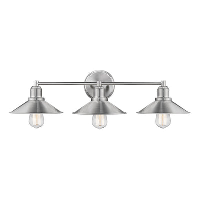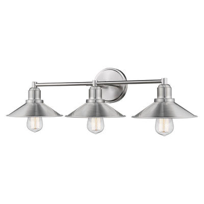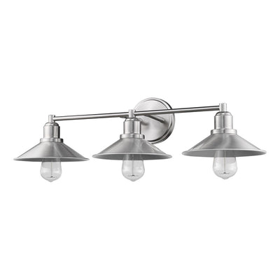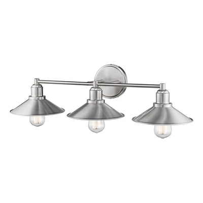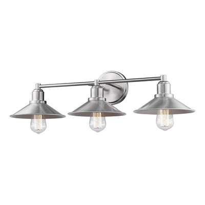 Call attention to a custom designed bath sink with this three-light vanity fixture. Sleek brushed nickel finish steel offers an authentic charm to a trio of hood shades and sweet vintage bulbs that infuse character.