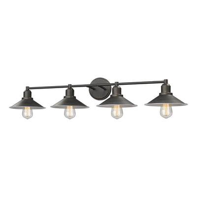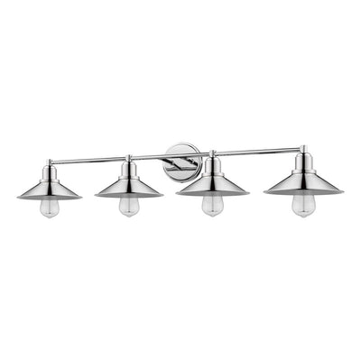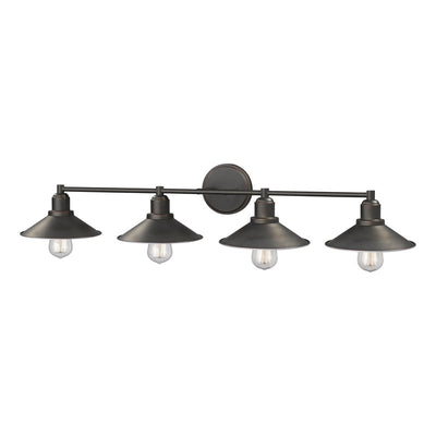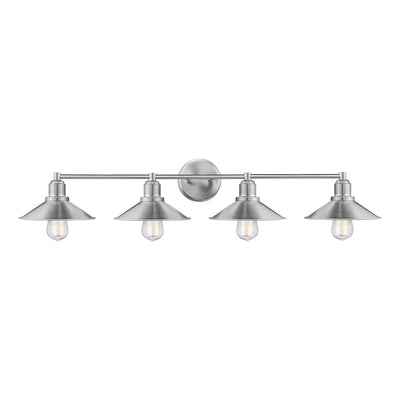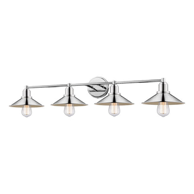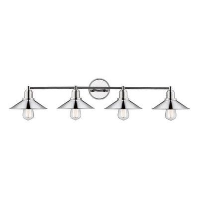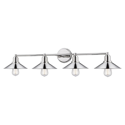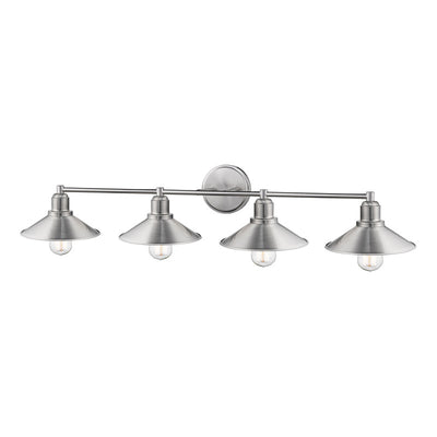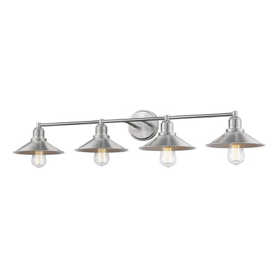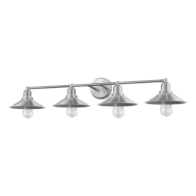 Finish the sophisticated ambiance of a custom designed master en suite with this stylish four-light vanity fixture. A collection of charming hood shades and a mounting bar in brushed nickel finish steel create an ideal host for soft and stylish vintage bulbs.
