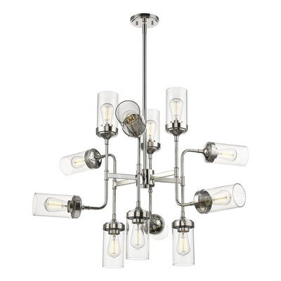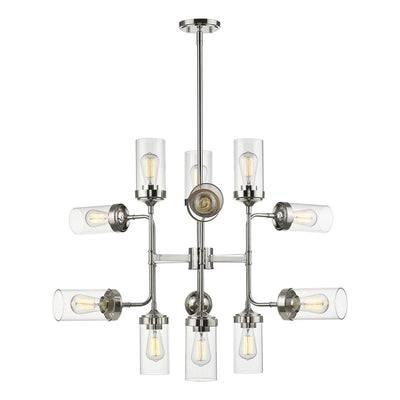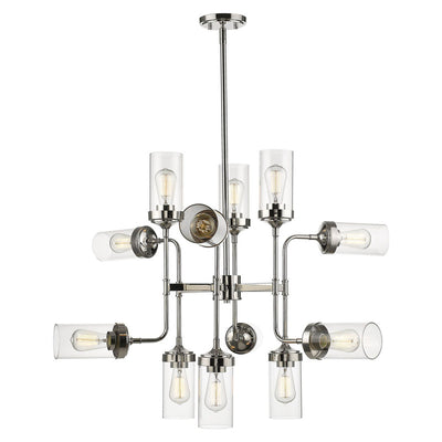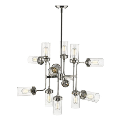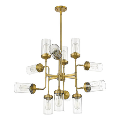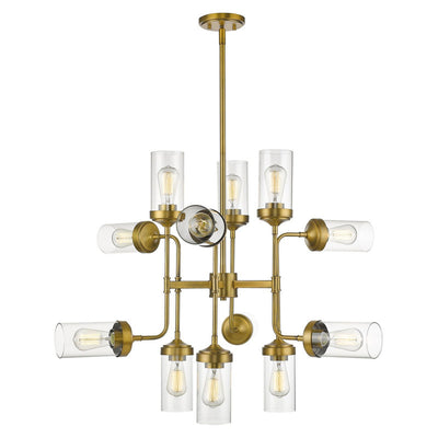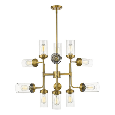Lean toward an attention-grabbing aesthetic that celebrates the industrial era, and add this 12-light pendant to a visible d�cor space. With vintage-inspired hardware and fittings creating a complex foundry brass finish steel frame, its cylindrical clear glass shades stand out and make a statement.
