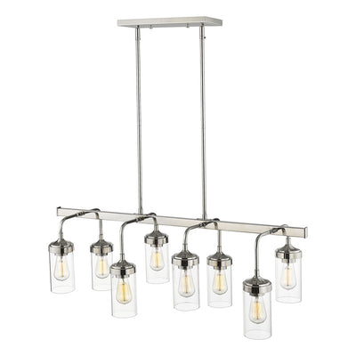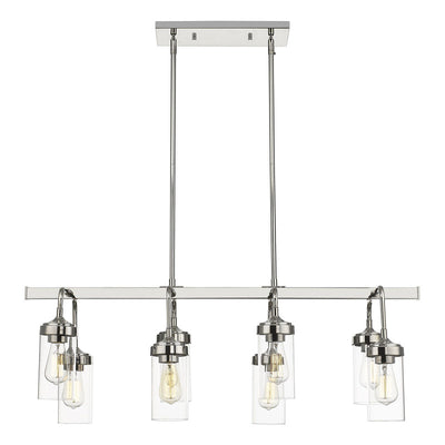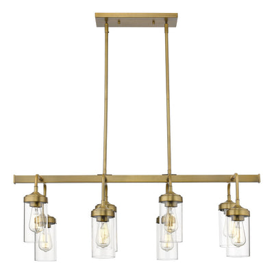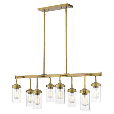 Rich in contemporary style yet boasting a distinct industrial flavor, this eight-light island pendant creates a compelling look in modern spaces. Gorgeous foundry brass finish steel hardware-inspired elements bring out the beauty in sleek cylindrical glass shades, creating an easy ambiance.