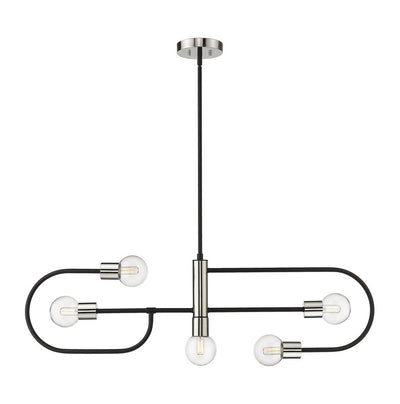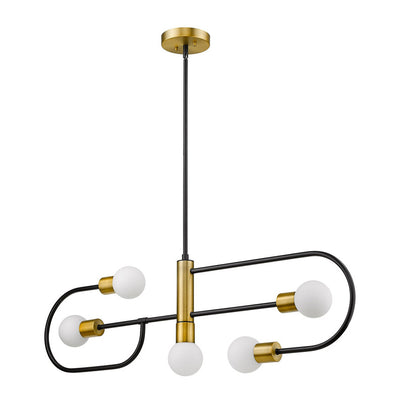 From the Neutra collection comes this vintage-inspired island light fixture, lending a charming mid-century modern flair to a contemporary style home. Five opal glass globes at each end of intermingled, curved matte black rods, accented with a warm foundry brass finish, cast a soothing, diffused glow. Hang this stylish and sophisticated steel lighting piece over a kitchen island or a billiard table in the game room for a retro Art Deco vibe.