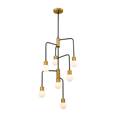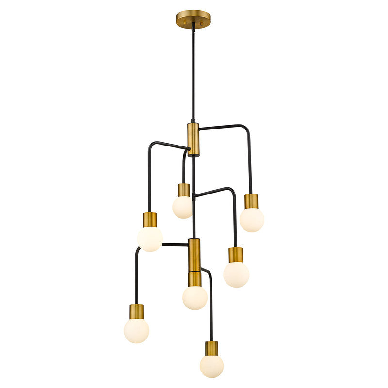 With a retro-inspired style and sophisticated charm, this contemporary seven-light chandelier comes from the Neutra collection. Seven opal glass globes diffuse a soothing glow across the space, while a two-tone finish in matte black and shiny foundry brass lends a contrasting, striking character. Hang this lovely steel chandelier in a lofty entryway or dining room for a handsome mid-century modern vibe.