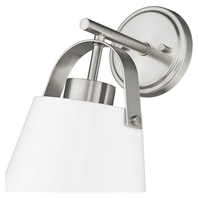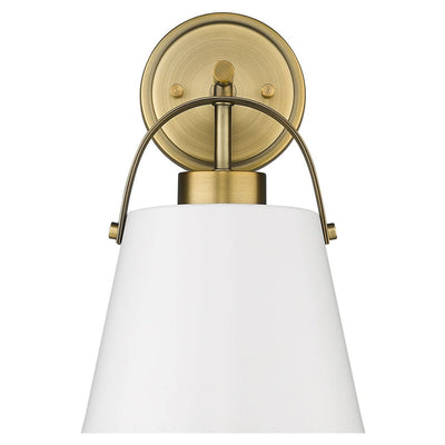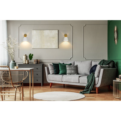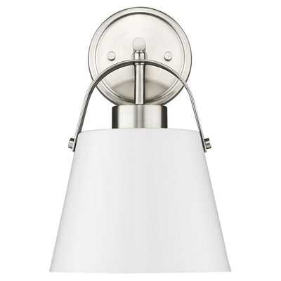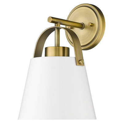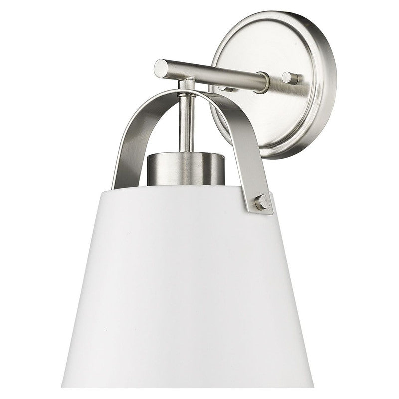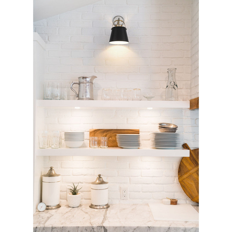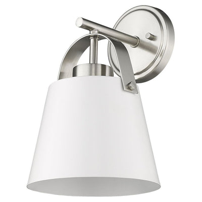 Classic industrial style adds a casual influence to this transitional single-light wall sconce, our latest addition to the popular Z- Studio Pendant family. With a tapered matte black or white shade supported by a rich, detailed metal accent in either a Brushed Nickel or Heritage Brass finish, it makes a superb choice for a modern farmhouse kitchen or Industrial space.
