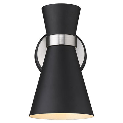 A decorative silhouette shapes industrial influence that adds casual elegance to this matte black finish steel one-light wall sconce. Dress up a bathroom or hallway with this tasteful light trimmed with brushed nickel finish steel. This sconce works perfectly paired with an identical match in a side-by-side arrangement around a doorway or hallway entrance.
