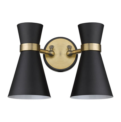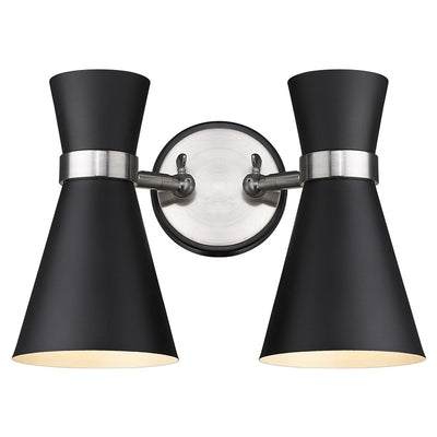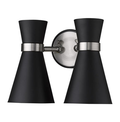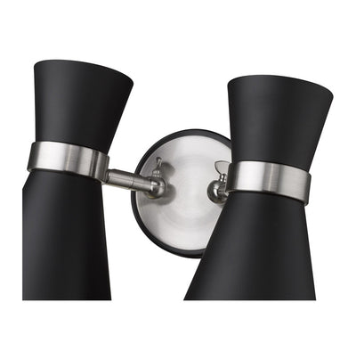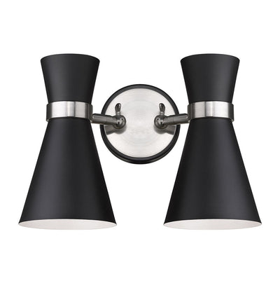 A decorative twin silhouette shapes industrial influence that adds casual elegance to this matte black finish steel two-light wall sconce. Dress up a bathroom or hallway with this tasteful fixture trimmed with brushed nickel finish steel. This dual sconce works perfectly as a bath light over a compact vanity.