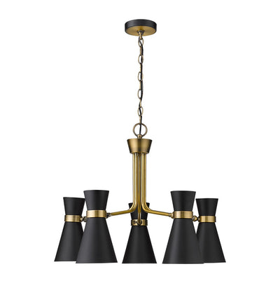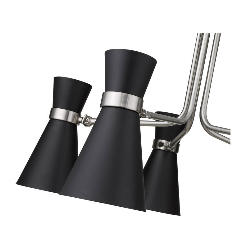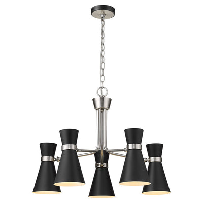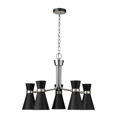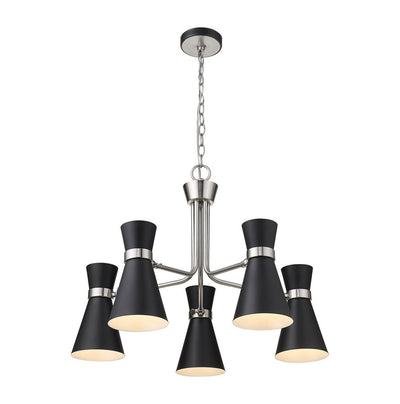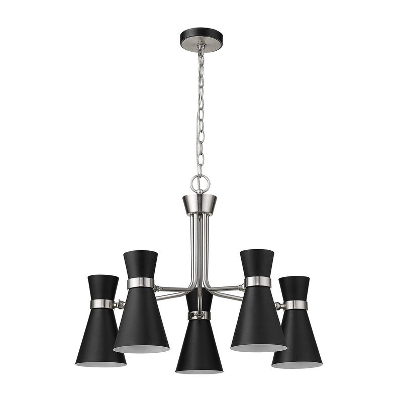 A decorative quintuplet silhouette shapes industrial influence that adds casual elegance to this matte black finish steel five-light chandelier. Dress up a dining or entertaining space with this tasteful fixture trimmed with brushed nickel finish steel. This sleek chandelier captures the heart of romantic industrial charm.