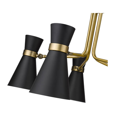 The Soriano Collection design in a mixed metal hourglass shape with asymmetric flair is the attractive focal point of this collection. The black finish is accented by brass or chrome details. Adjustable directional shades make this collection not only fashionable but functional as well.