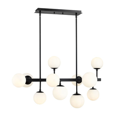 Send visual cues upward to capture a whimsical, charming look in an entertainment space. Modern styling with strong industrial elements forms a delightful island/billiard light that works in a casual kitchen as well. A linear matte black finish steel frame sets the stage for a festive arrangement of eleven matte opal glass globe bulbs to create mood-lifting ambiance that lends a hint of space-age personality to this enticing light.