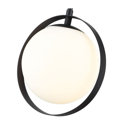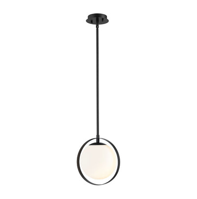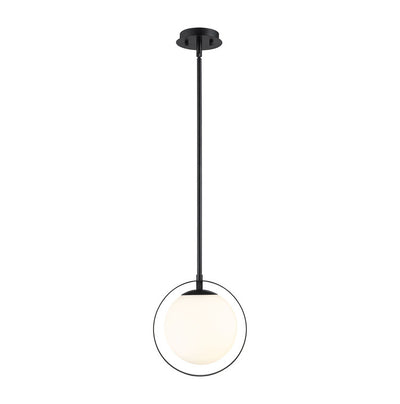 Send visual cues upward to capture a whimsical, charming look in a dining or main living space. Modern styling with strong industrial elements forms a delightful mini pendant light that lights up a compact kitchen, dinette, or reading space. A linear matte black finish steel frame sets the stage for a single matte opal glass globe bulb encased in an open steel ring to create mood-lifting ambiance that lends a hint of space-age personality to this enticing light.