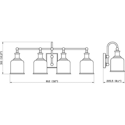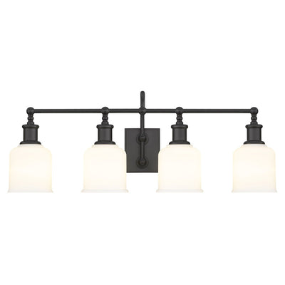 Village-inspired charm borrows from a nautical theme to create an inspiring look for traditional and transitional bath spaces in this four-light vanity from the Bryant collection. With a bold matte black finish steel frame and wall mount, its chic opal glass shades form a fabulous palette contrast. A curved arm, ornate holders, and lipped shades generate extra charm that stylize a custom bath space.