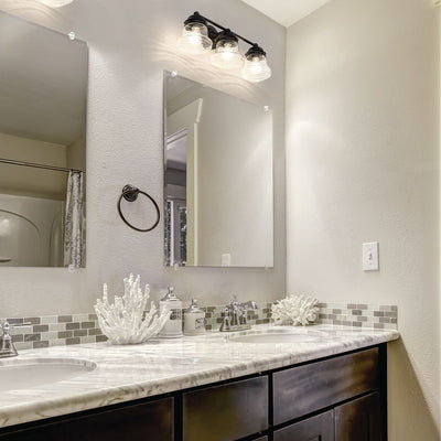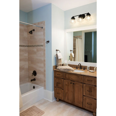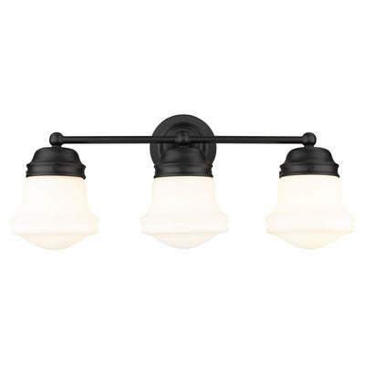 Charming schoolhouse style shades crafted of matte opal glass tell the story of a nautical industrial theme that lends a ton of style to this three-light vanity light. Perfectly suited for a traditional or transitional bath space, this light from the Vaughn collection contrasts bold matte black steel with opal glass, delivering a striking look that is timeless and elegant. This light fixture stands out as a central focus.