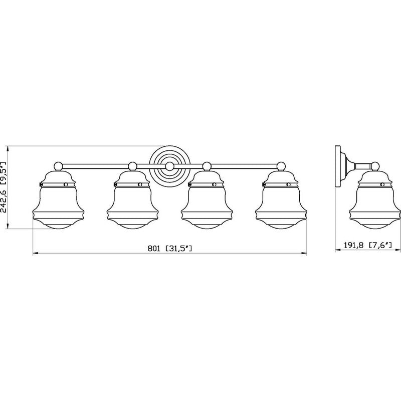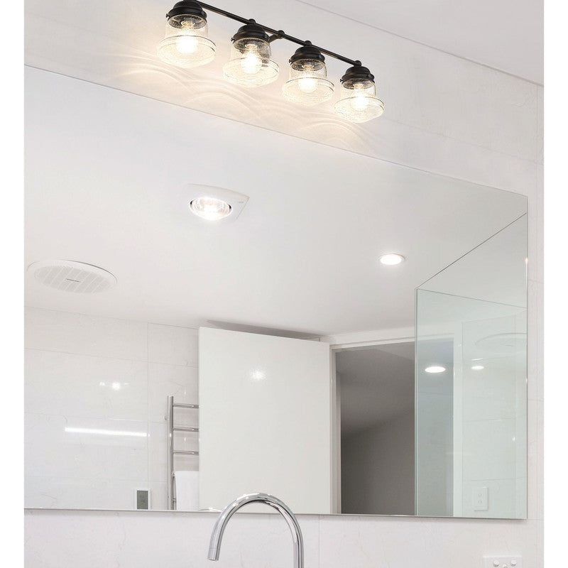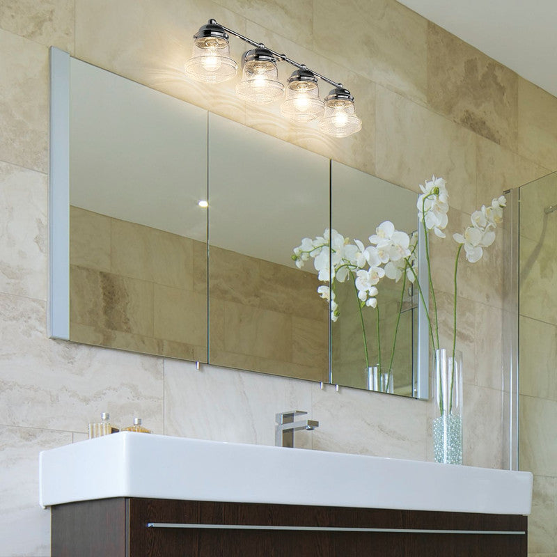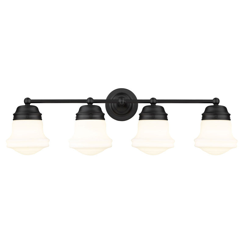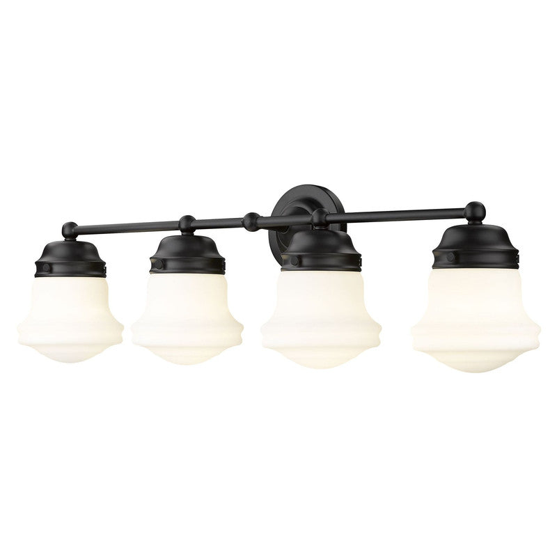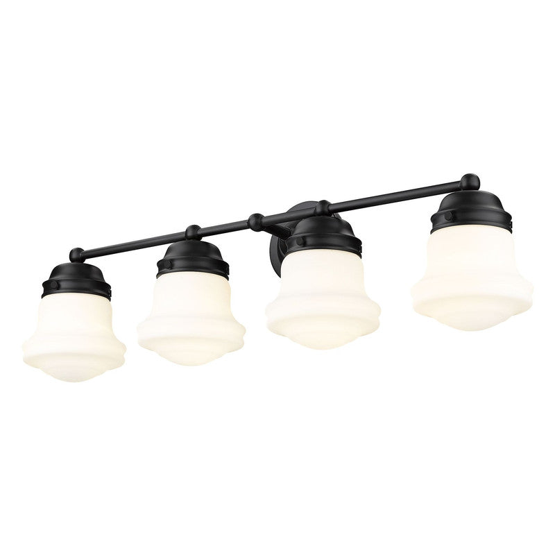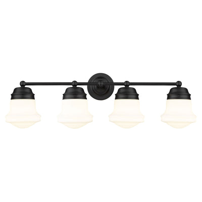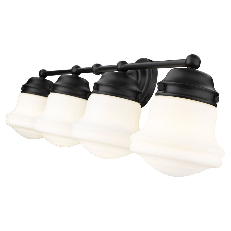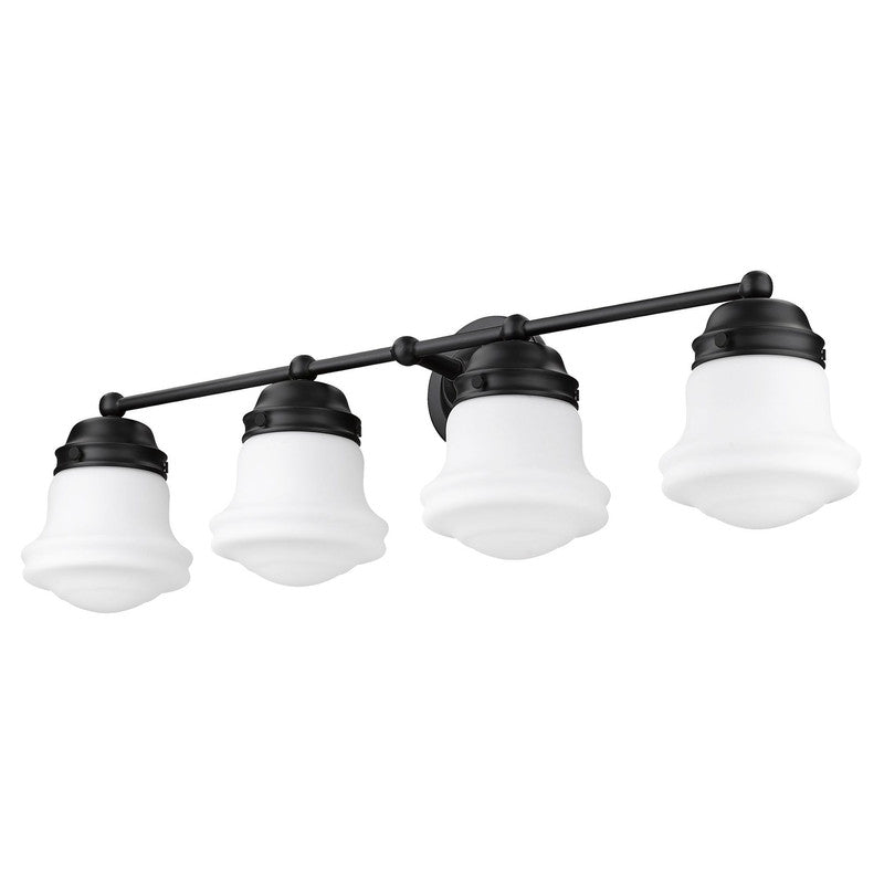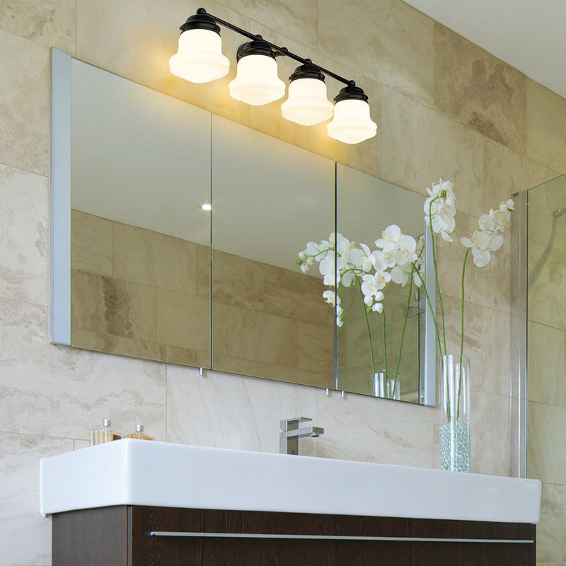 Indulgent village-inspired charm mixes nautical with industrial, forming a themed look that lifts the ambiance in any bath space. This four-light vanity light from the Vaughn collection embellishes a mid-size bathroom with a contrasting blend of matte black finish steel and matte opal glass shades in a schoolhouse silhouette.