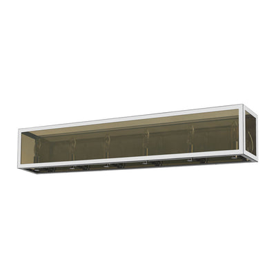 Choose this decadent contemporary six-light vanity light for its chic blend of steel and mirror, and a geometric linear silhouette that updates modern bathrooms. A double frame made from chrome finish steel joins both clear and smoke glass to deliver a soothing, atmospheric aesthetic with plenty of inspiration. Candelabra bulb mounts create an opportunity to change up the motif and fit into transitional spaces.