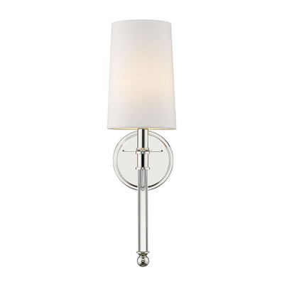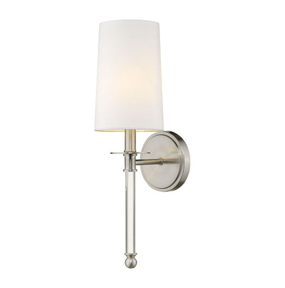Graceful modern design creates a lift for contemporary bathrooms, bedrooms, and hallways with this elegant one-light wall sconce. Indulge in an artistic linear silhouette blending brushed nickel finish steel with delicate crystal, forming an enticing vertical stem. A fresh white fabric shade seals the classic look of this sconce, a perfect solution for a challenge of extra lighting.