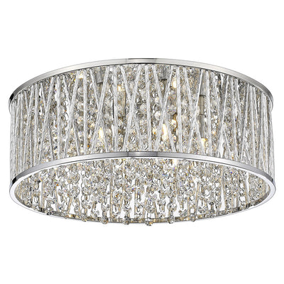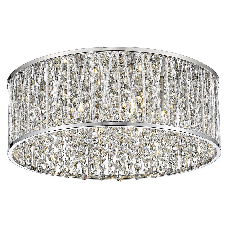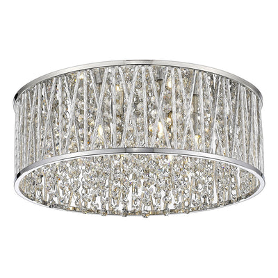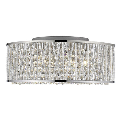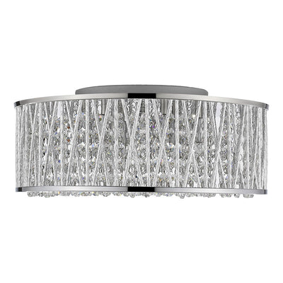 This gorgeously airy modern six-light flush mount lighting fixture with sleek lines of chrome finished aluminum add a contemporary luster to a metropolitan influenced style. The unusual crossed and single chrome line shade pattern intertwined with gleaming and glittering lines of polished crystals shines in an elegantly modern style.