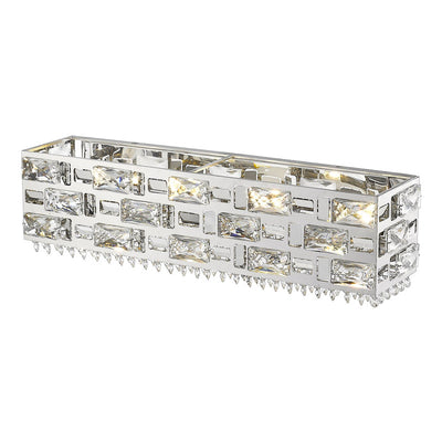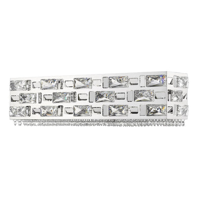 All eyes avert to the extraordinary look of this chrome and crystal four-light vanity light. A solid choice for upscale contemporary en suite units, its tasteful silhouette offers rectangular cutouts and crystal emblems that dazzle and create an air of mystery.