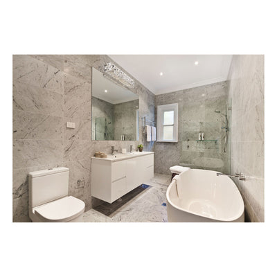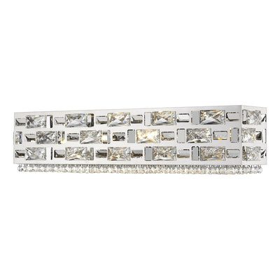 This five-light vanity light captures the arrestable elegance that makes a statement in a contemporary master en suite. Enjoy an extraordinary blend of radiant chrome steel and rectangular cutouts that show off tasteful crystal emblems, sending an air of decadence around your space.