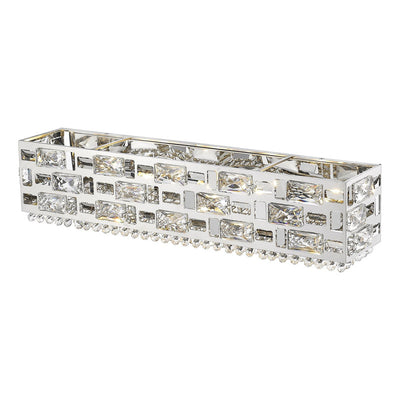 The contemporary styled laser cut design of the Aludra collection define its signature look. Through the varied openings, beautiful rectangle crystals are revealed and surrounded in a highly polished Chrome finish. The Aludra collection is available in different fixture types and sizes.