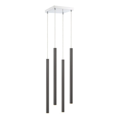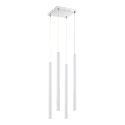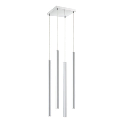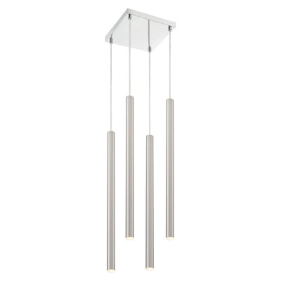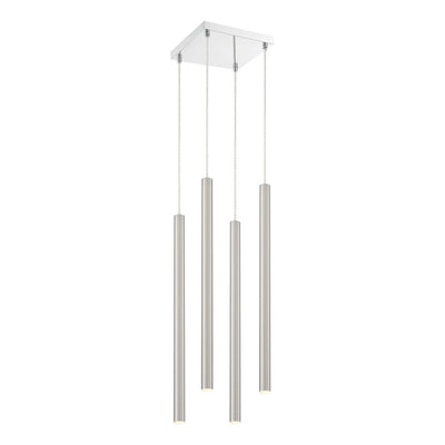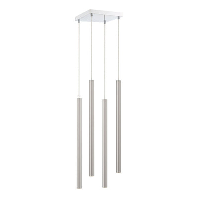 Radiant brushed nickel makes this four-light pendant light perfect for a modern bathroom. Complete with a windchime-inspired silhouette, the clean lines boast a sleek feel.